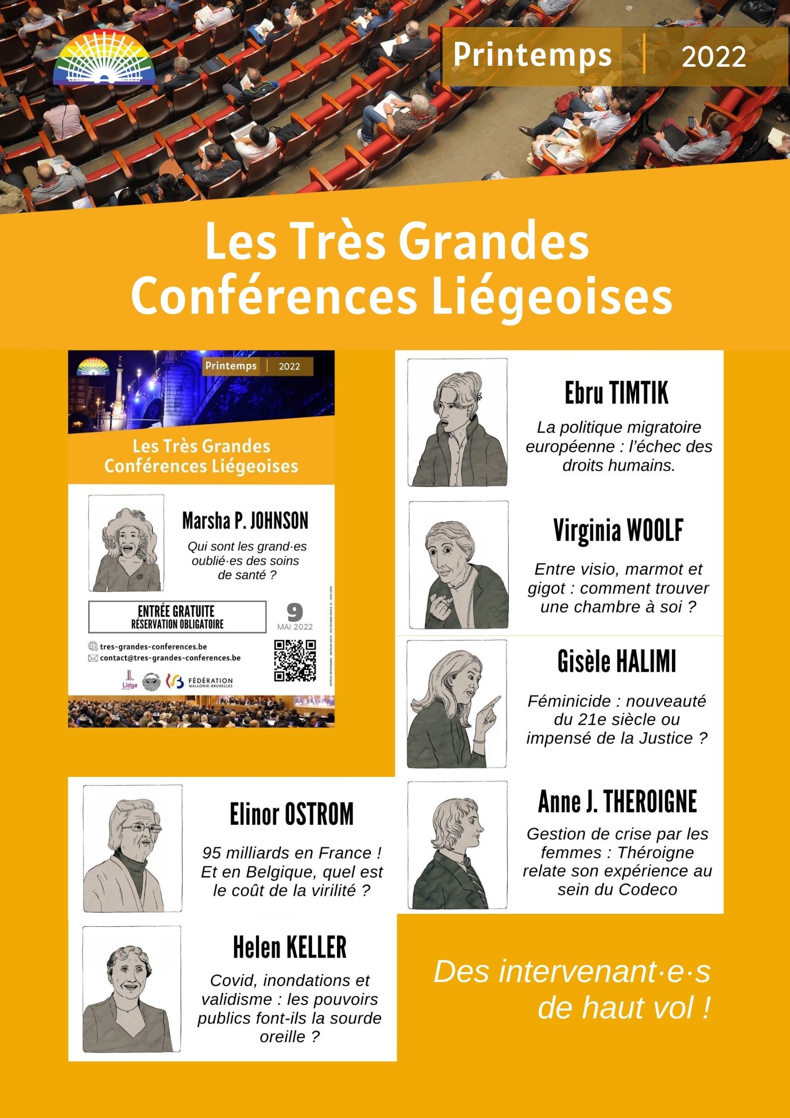 Ces très grandes conférences permettront à sept très grandes intervenantes spécialistes de s’exprimer, de façon (im)pertinente et plurielle, sur différents sujets d’actualité tels que les soins de santé, les féminicides ou les droits humains.